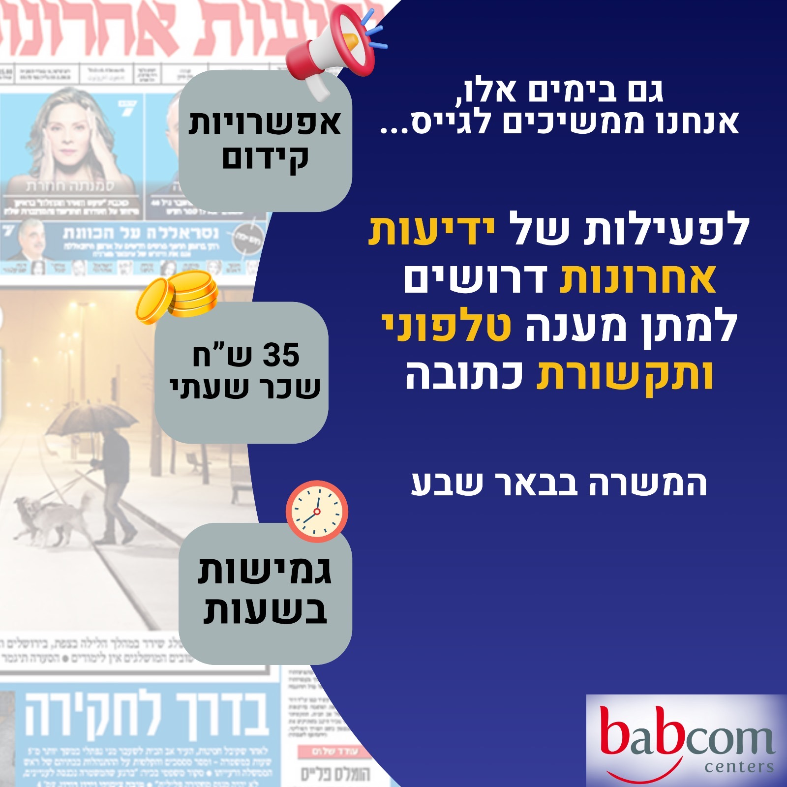 למוקד ידיעות אחרונות בבאר שבע דרושים/ות נציגי /ות שירות לקוחות מענה טלפוני משולב עם מענה בצ׳אט מענה קליל למנויים שעות פעילות ראשון עד חמישי 8-16 שישי לסירוגין 8-13