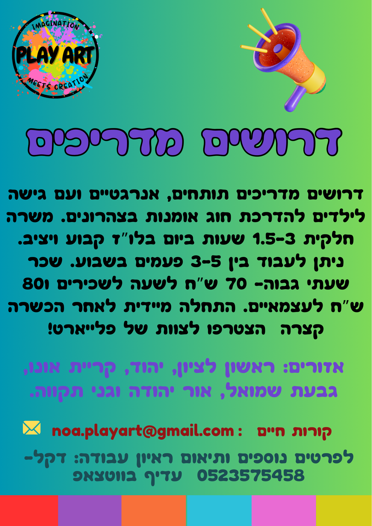 דרושים/ות מדריכים/ות הדרכת חוגי ילדים באיזור ראשל"צ ובקעת אונו בתחום האמנות