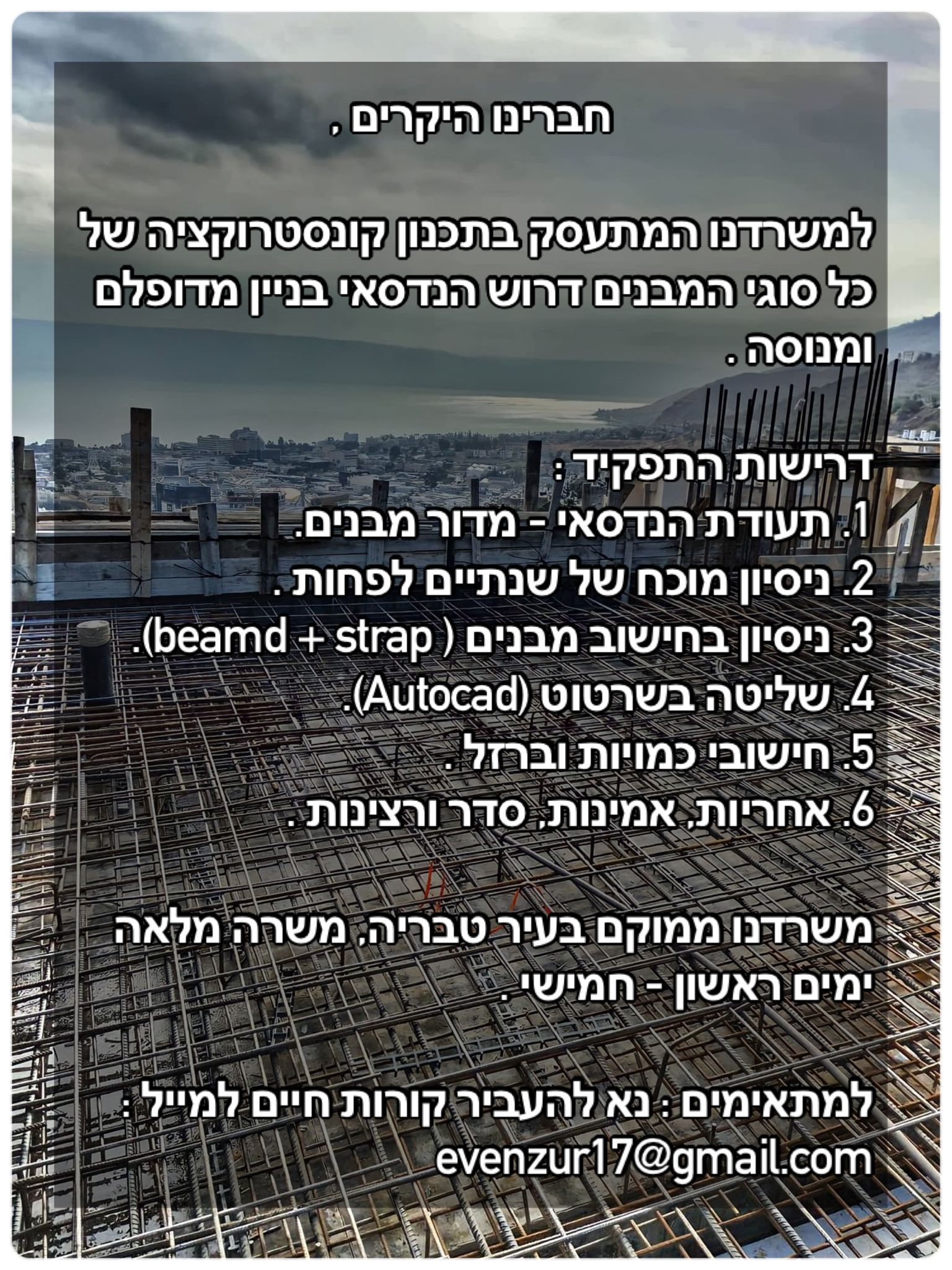 למשרד תכנון בטבריה דרוש/ה הנדסאי/ת בנין + הנדסאי/ת אדריכלות עם ניסיון שנתיים בתכנון למשרה מלאה