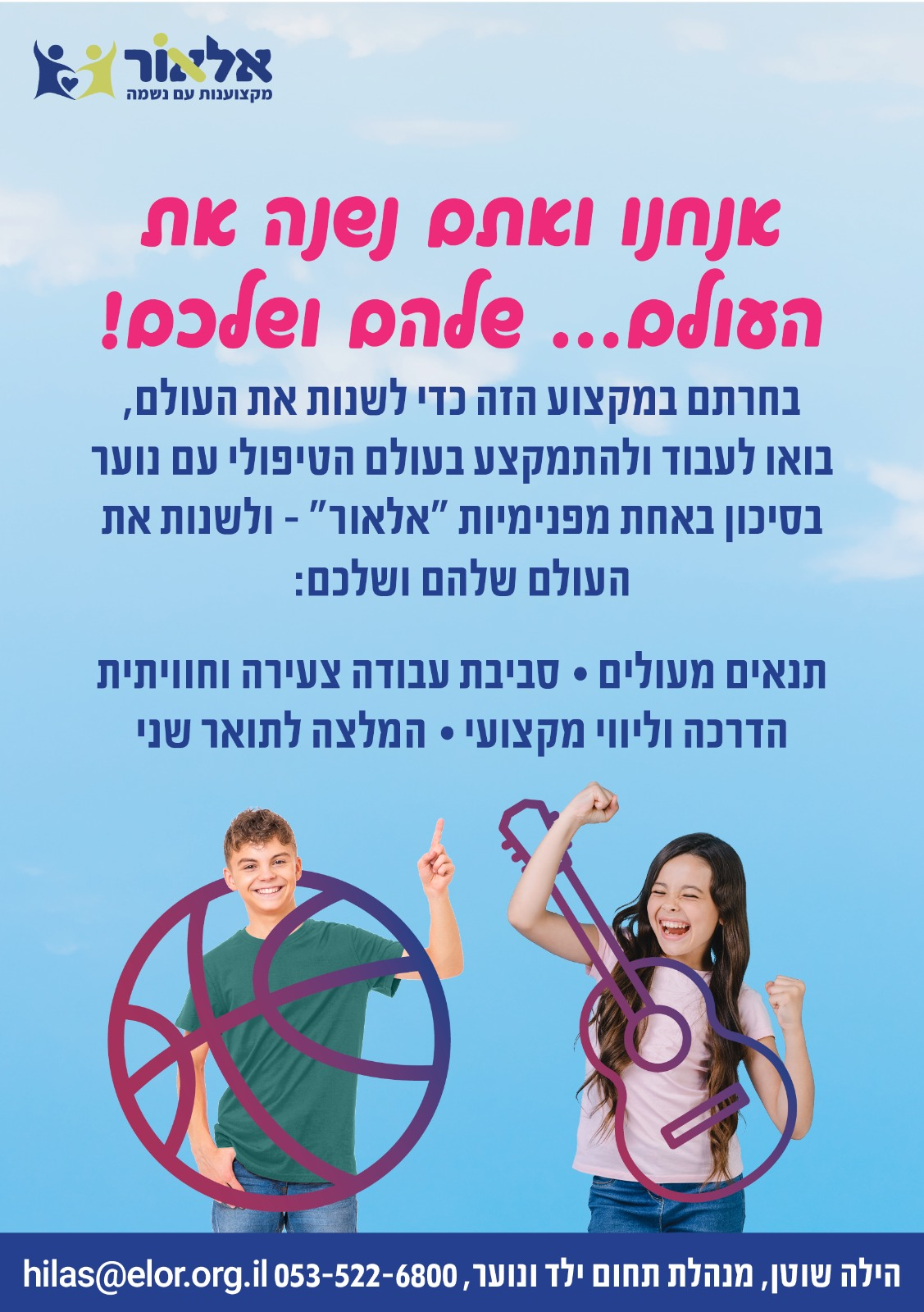 לפנימייה בשדה יצחק (ליד חדרה) דרוש\ה עו"ס\ית. בחרנו במקצוע הזה כדי לשנות את העולם, בואו לעבוד ולהתמקצע בעולם הטיפולי עם נוער בסיכון באחת מפנימיות "אלאור" ולשנות את העולם שלהם ושלכם: תנאים מעולים*סביבת עבודה צעירה וחוויתית *הדרכה וליווי מקצועי* המלצה לתואר שני