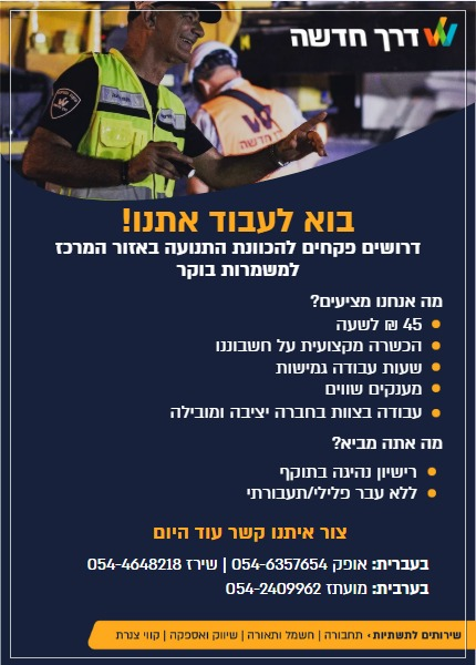 דרך חדשה בוא/י לעבוד אתנו! דרושים/ות פקחים/ות לכוונות התנועה באזור המרכז למשמרות בוקר מה אנחנו מציעים? • 45 ש"ח לשעה • הכשרה מקצועית על חשבוננו • שעות עבודה גמישות • מענקים שווים • עבודה בצוות בחברה יציבה ומובילה מה את/ה מביא? • רישיון נהיגה בתוקף • ללא עבר פלילי/תעבורתי