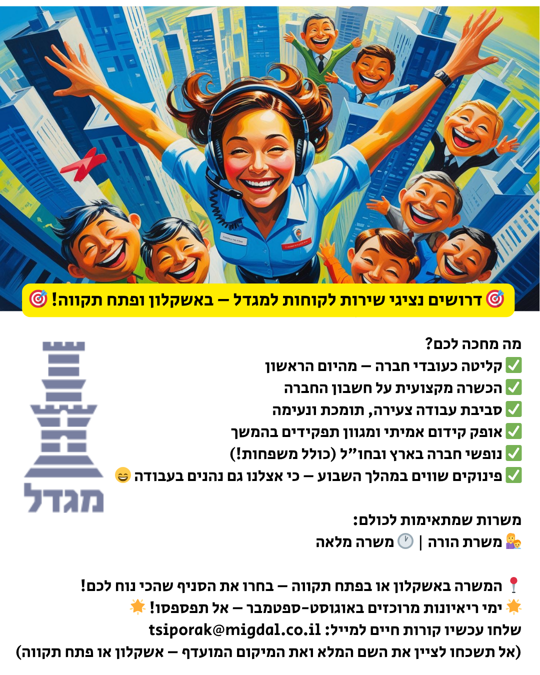 📍 המשרה באשקלון או בפתח תקווה – בחרו את הסניף שהכי נוח לכם!