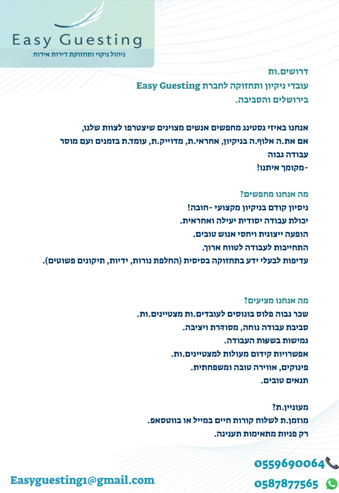 תחום עיסוק: אחזקה וניקיון משרה: ניהול משק בית איזור עבודה: ירושלים שכר: גמיש