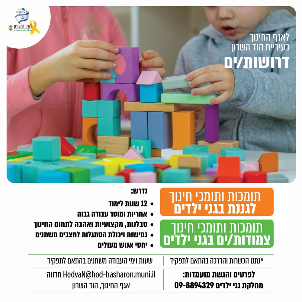 תומכ/ת חינוך בגניי העירייה של הוד השרון, המשרה היא לבוקר/צהרים, עובדת עירייה מהיום הראשון.